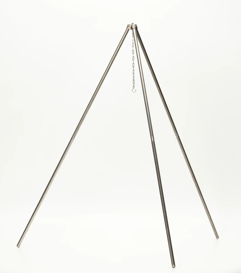 The TOAKS Titanium Portable Tripod is a lightweight, collapsible tripod designed to suspend pots, kettles, lanterns, or water jugs over an open fire. Constructed almost entirely from titanium, it packs down small for transport and adjusts quickly on site with a titanium chain, S‑hook, and adjustment key for precise height control.